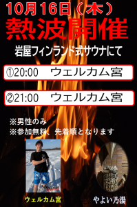 10月16日(木)、岩屋フィンランド式サウナで熱波イベントを行います。