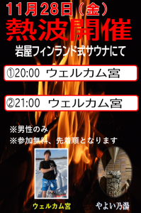 熱波イベントを行います 2025/11/27 11月28日(金) 岩屋フィンランド式サウナで熱波イベントを行います🔥 今回はウエルカム宮さんに来ていただき、男性側で行います♪ 参加無料、先着順となっております。 1回目 20時 ウエルカム宮 2回目 21時 ウエルカム宮 皆様のご来店を心よりお待ちしております!