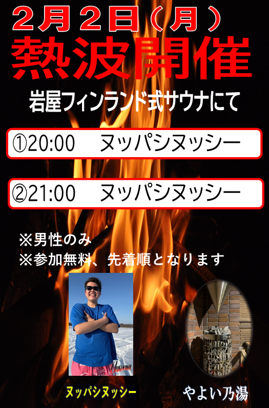 2月2日(月)、岩屋フィンランド式サウナで熱波イベントを行います。